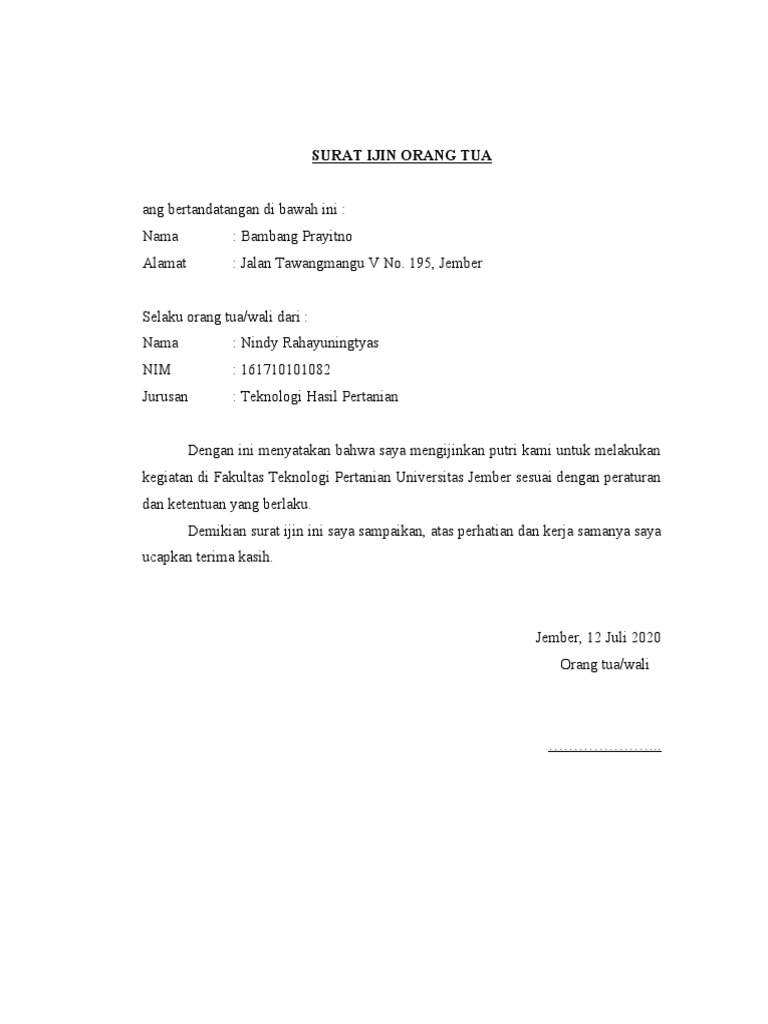 Jalan terusan pasir koja, gang pak sumardi no.84/194a rt 01 rw 05, kelurahan sukahaji, kecamatan babakan. Dalam dunia sekolah, kuliah, maupun dunia kerja, terkadang para siswa atau pekerja membutuhkan surat persetujuan dari orang tua untuk mendapatkan izin oleh karenanya bagi sobat yang masih bingung cara menulis surat izin orang tua, sobat bisa menyimak contoh surat izin berikut ini. Kepala baak universitas gunadarma di tempat hal : Dan akan mentaati dengan segala peraturan yang berlaku. Savesave surat ijin orang tua.docx for later.